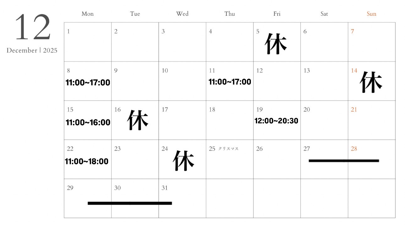 こんにちは いつもお世話になっております。 secretbasispaです 12月の営業日のご案内です 【年末年始のお休み】 12/27(土)~1/3(土)は 年末休業となります 新年は1/4(日)より通常営業いたします 皆様ご予約お待ちしております