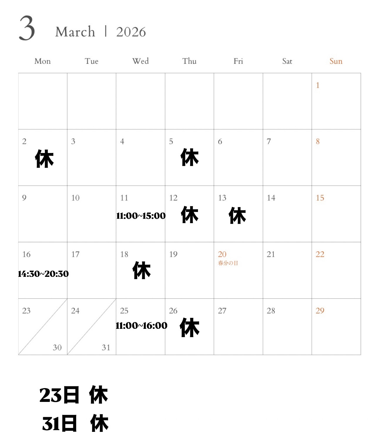 3月の営業日のご案内です